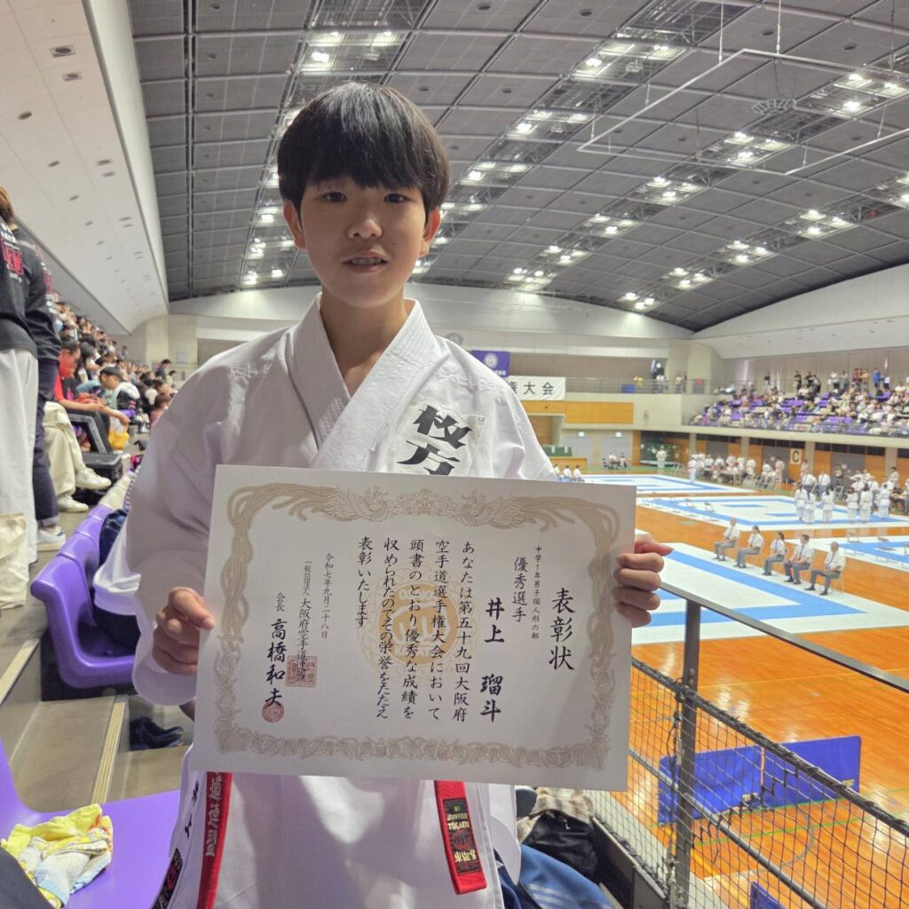 その中で、中学1年生男子組手の部で優秀選手賞をいただきました。